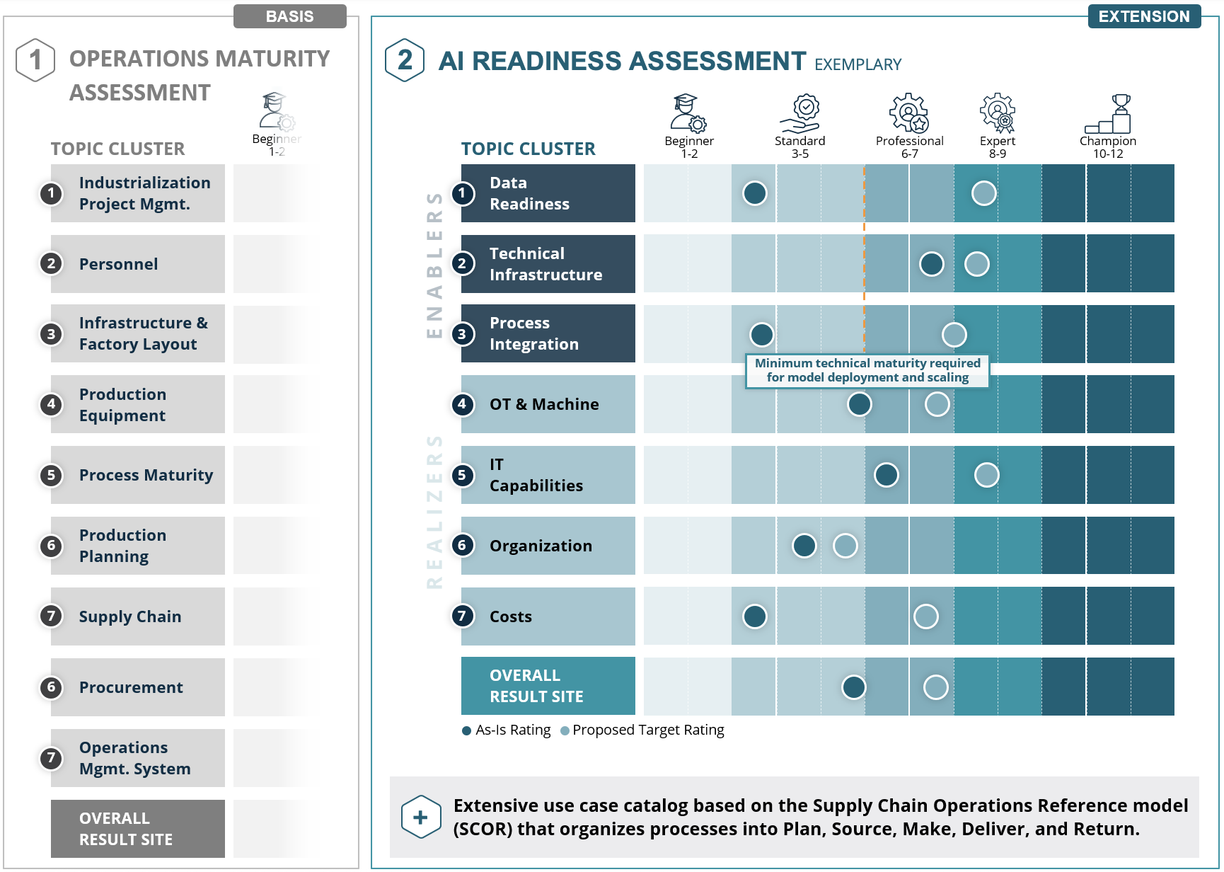 The Operations Maturity Assessment identifies structural bottlenecks in current performance, such as chronic bottlenecks, scrap hotspots, and launch instability, and prioritizes areas where AI can have the greatest impact. The second is the AI Readiness Assessment, which evaluates seven capabilities across more than 100 criteria to determine whether a plant can reliably scale those use cases beyond a single line or program.