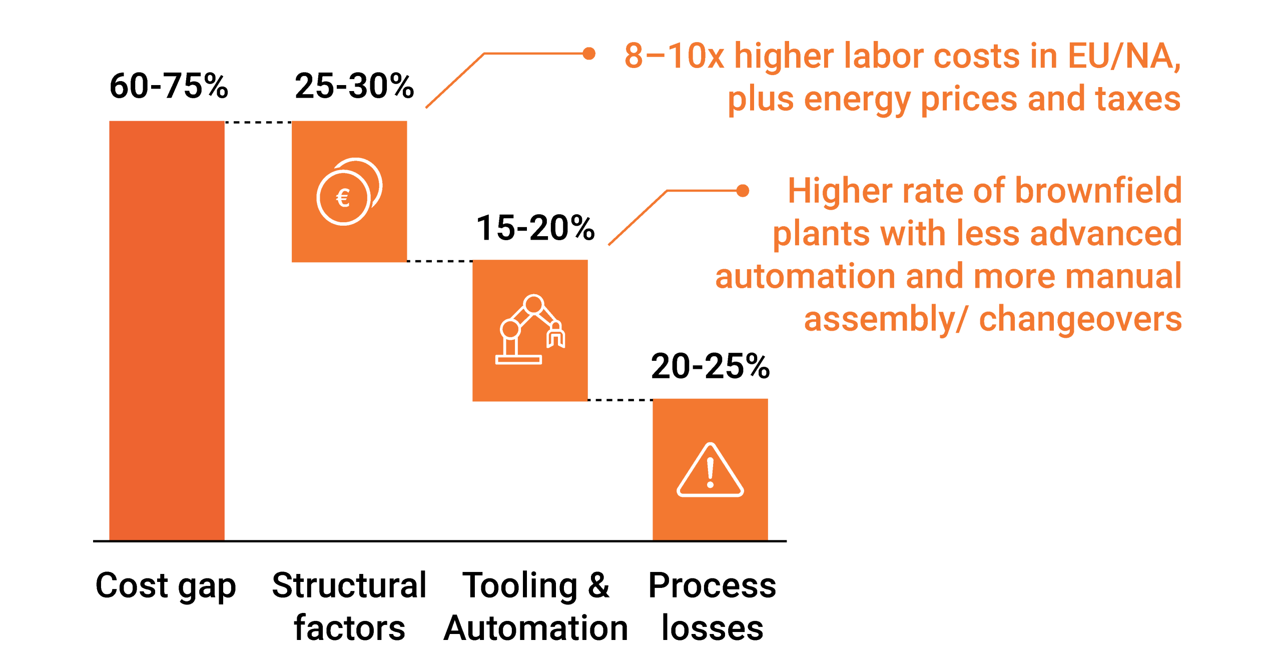 In manufacturing alone, cost gaps can reach 60–75%, with direct labor being a major driver. Labor costs in Europe are eight to ten times higher than in Asia, yet the output per worker is falling behind. While China recorded a 4% increase in labor productivity between 2023 and 2024, Germany saw a 4.3% decline from 2024 to 2025. However, a significant portion of the cost gap is controllable through automation, tooling, facilities, and equipment choices.