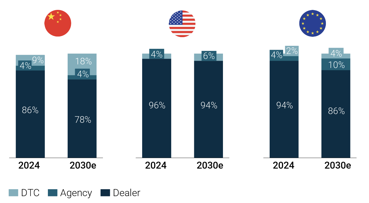 • China: Market entry often begins via pure DTC (online sales and branded showrooms), with dealer networks introduced later. Younger customer bases and digital adoption accelerate experimentation (especially for upcoming NEV brands).
