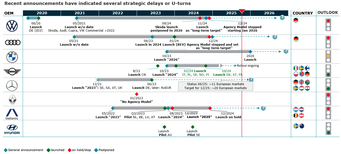 Yet, as the dust settles, many of these initiatives have stalled or reversed. Recent announcements from OEMs such as Volkswagen and Stellantis underscore a broader reality: the pure agency or DTC model is not scaling as expected. Many launches have been postponed (e.g., BMW), halted, canceled (e.g. Skoda, VW), or reframed as “long-term targets.” In short, what was once seen as an unstoppable wave has proven to be a costly and uncertain experiment.