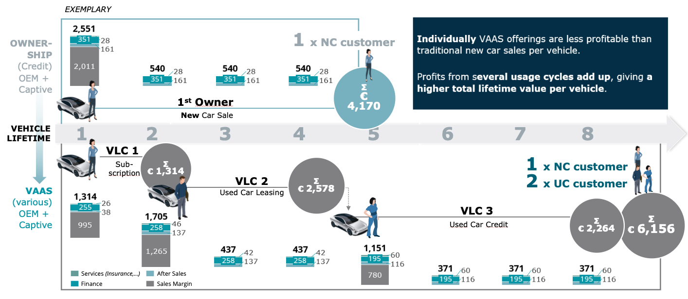 Each cycle—be it a subscription, a used car lease, or a second-life credit program—adds incremental margin from aftersales, finance, and services. While individual VAAS contracts may be less profitable than a new sale, the aggregated profit across three or more cycles surpasses traditional models significantly. In one case example, a single vehicle generated over €6,000 of cumulative profit across three lifecycle stages, compared to less than €4,200 in a one-off new car sale.