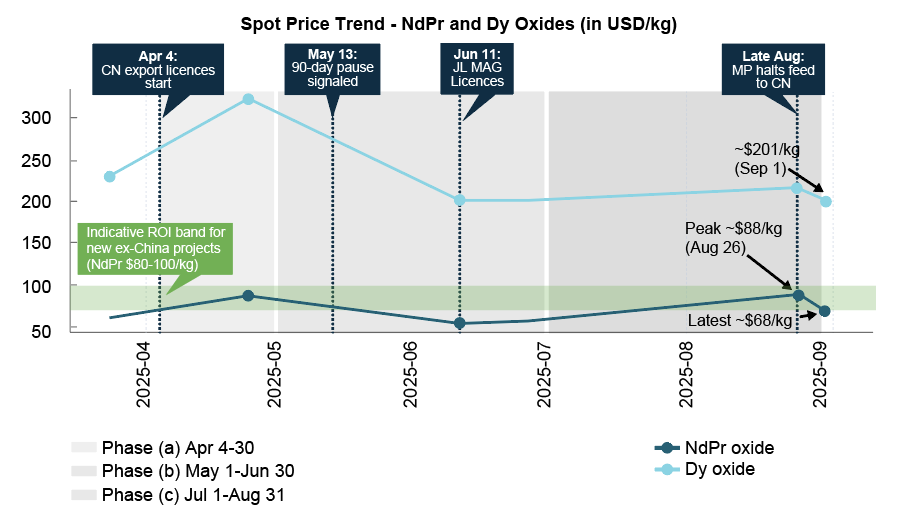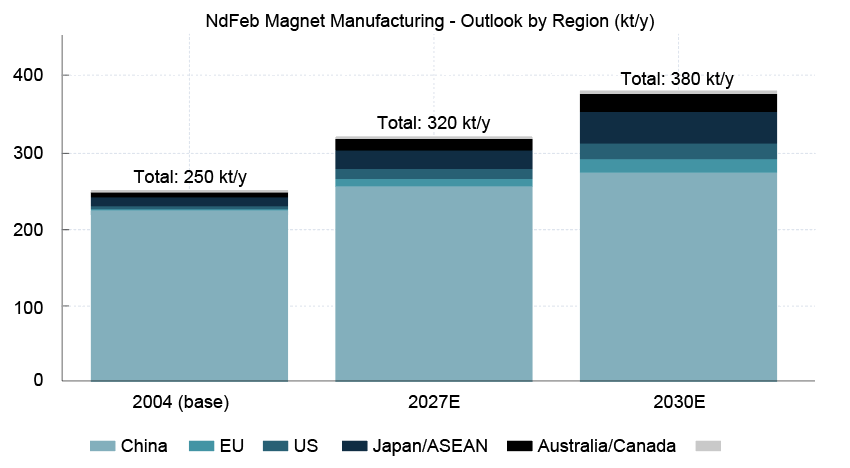 • Cost gap: New non-China projects often need NdPr ~$80–100/kg to break even vs. China ~$50–60/kg;